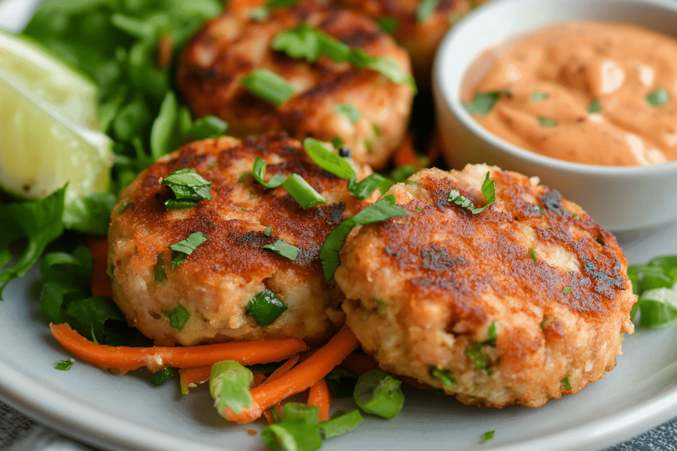 Asian tuna cakes are savory patties made from canned tuna mixed with seasonings, herbs, and a binding agent, then pan-fried until crisp on the outside and tender inside. The “Asian” twist comes from ingredients like soy sauce, sesame oil, green onions, and a topping of spicy mayo for balance.