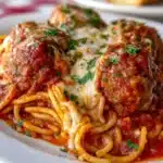 A comforting and cheesy classic combining spaghetti, savory meatballs, and rich marinara sauce baked to perfection.