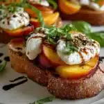 A delightful toast topped with fresh peaches, creamy burrata, and tangy balsamic glaze, celebrating the flavors of summer.