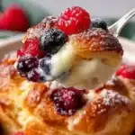 A decadent bread pudding-style bake featuring buttery croissants and a medley of juicy berries, all soaked in a creamy custard.