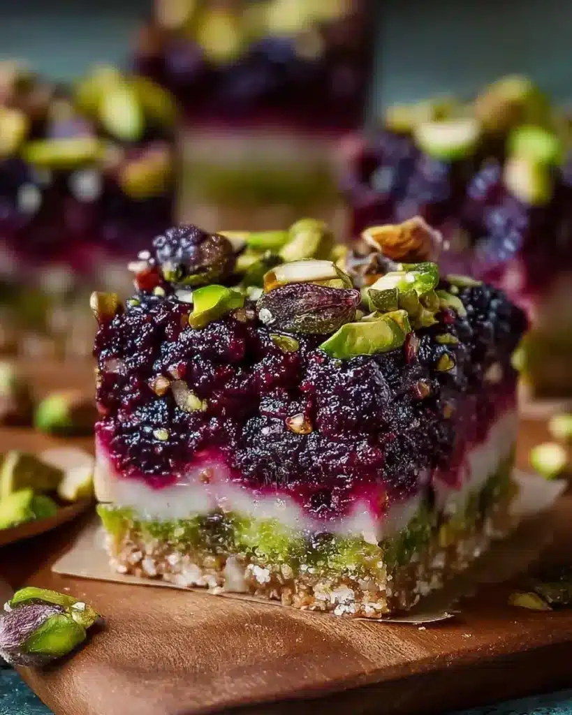 In many cultures, desserts like these serve as a bridge to tradition. The blackberry’s deep, dark hue and the vibrant green of pistachios not only look stunning together but convey a sense of celebration—making any occasion feel just a little more special. Perhaps inspired by a summer fruit harvest or memories of family picnics, these bars are anchored in experiences that many cherish.