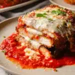 A comforting twist on classic Italian eggplant parmesan featuring layers of crispy chicken, eggplant, marinara sauce, and gooey cheese.
