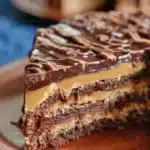 A delightful no-bake chocolate cake layered with creamy dulce de leche and cream cheese, perfect for any occasion.