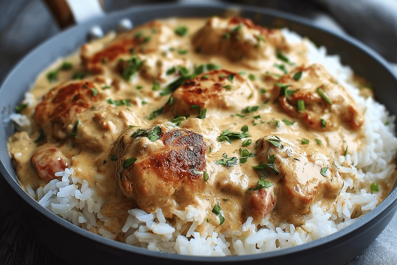 Creamy Smothered Chicken and Rice is a one-pan dinner that features pan-seared chicken simmered in a velvety garlic-herb cream sauce, served over tender long-grain rice. It’s hearty, soulful, and weeknight-friendly—with every spoonful tasting like a warm memory.