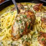 A comforting and creamy dish of slow-cooked chicken with Italian seasoning, served over angel hair pasta.