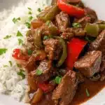 A warm and comforting Crock Pot Pepper Steak filled with tender beef, colorful bell peppers, and a savory garlic-ginger sauce, perfect for family dinners.