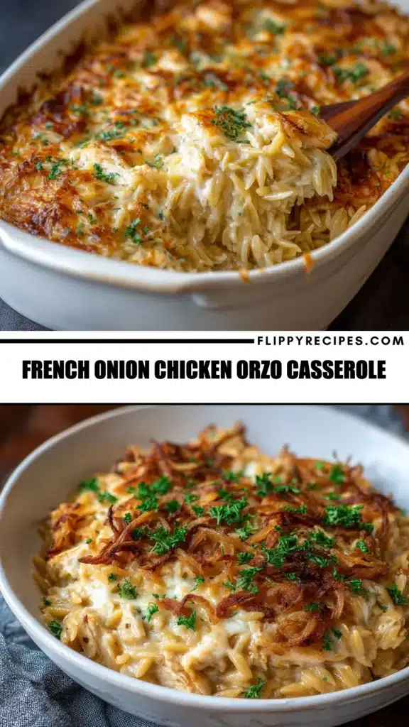 I encourage you to try this French Onion Chicken Orzo Casserole in your own kitchen. Whether it’s a weeknight dinner or a special gathering, this dish is sure to bring smiles and satisfaction to your table. Don’t forget to share your experiences in the comments below! I would love to hear how your casserole turned out and any personal touches you added. Happy cooking, and may your kitchen always be filled with love and delicious aromas!
