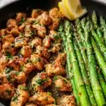 A comforting dish featuring succulent chicken bites and vibrant asparagus in a buttery, garlicky glaze.