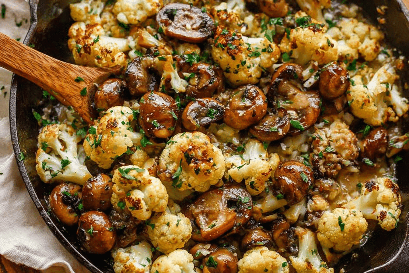 The garlic mushrooms cauliflower skillet is a quick one-pan side dish (or light vegetarian main) that combines sautéed mushrooms and cauliflower florets with garlic, herbs, and a hint of heat. The cauliflower gets crisp-tender, the mushrooms turn golden and savory, and the garlic? It ties it all together like a warm hug.