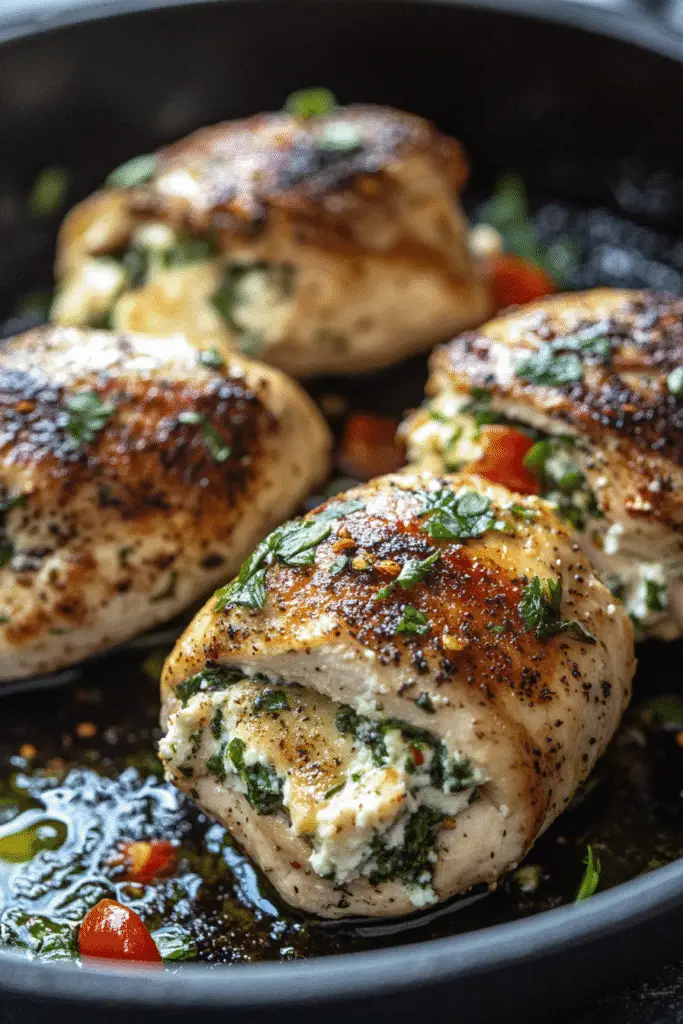 - Sear the chicken: Heat olive oil in a skillet over medium heat. Add the stuffed chicken breasts and sear for 3-4 minutes on each side until golden brown. This step locks in the flavors and creates a beautiful crust.