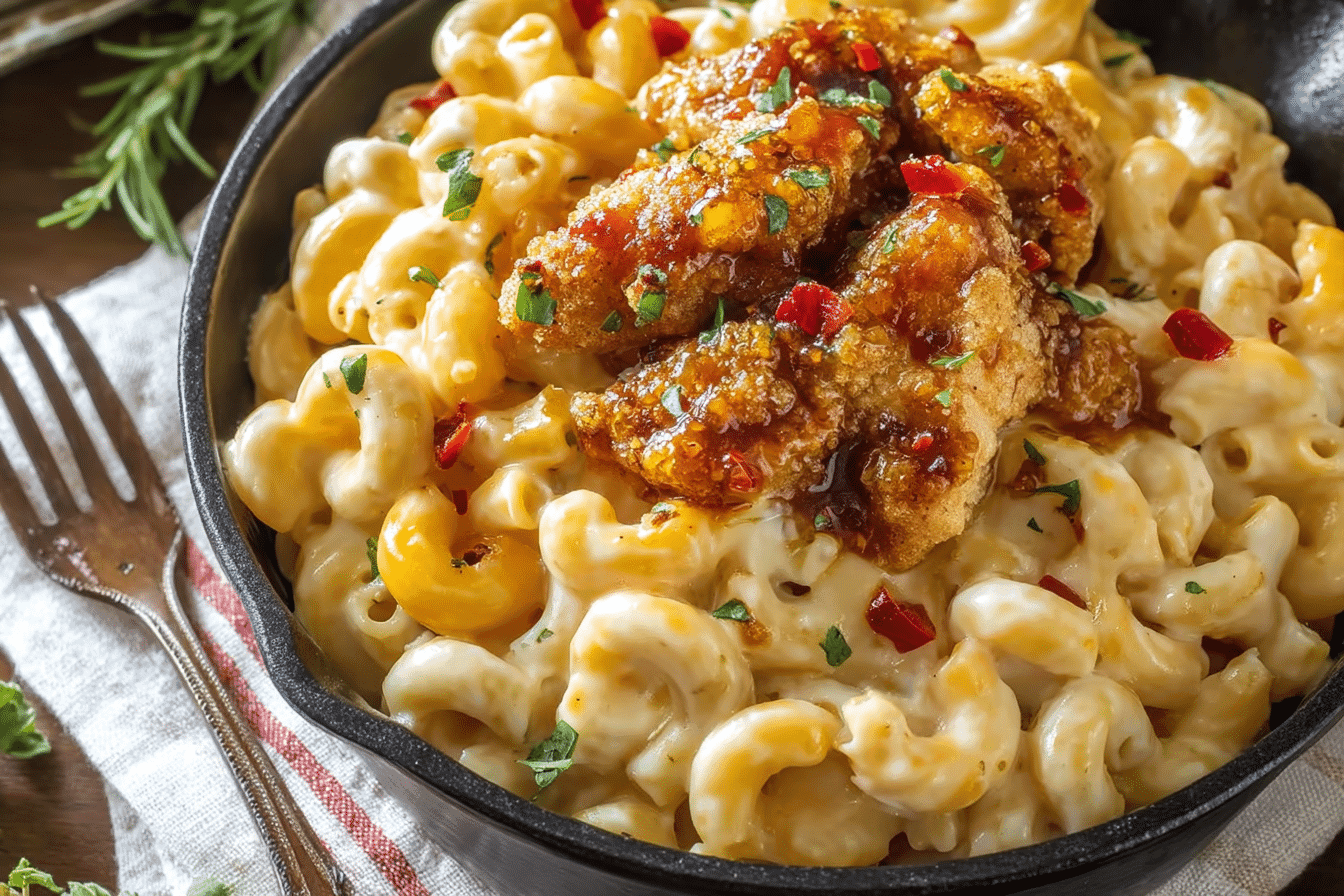 Crispy chicken tossed in sweet honey pepper sauce meets creamy, baked mac and cheese in this comfort food classic.