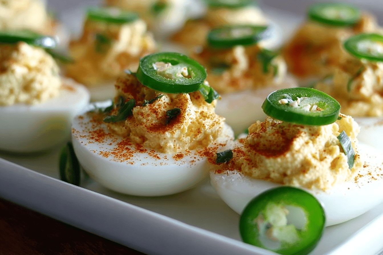A spicy twist on classic deviled eggs made with creamy yolks, mayo, mustard, and jalapeños.
