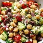 A vibrant Mediterranean salad featuring chickpeas, feta cheese, and fresh vegetables, perfect for a healthy meal.
