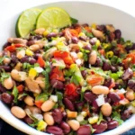 A vibrant and refreshing salad combining black beans, corn, and colorful peppers, dressed in a zesty lime vinaigrette.
