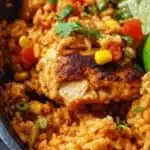 A hearty, all-in-one dish featuring chicken thighs, rice, vegetables, and a blend of spices that celebrate Mexican cuisine.