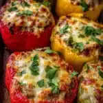 Colorful bell peppers filled with a hearty mixture of ground beef, rice, beans, corn, and cheese, baked to perfection.