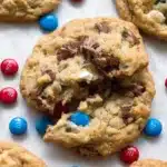 Deliciously large cookies packed with peanut butter, oats, chocolate chips, and M&Ms, perfect for sharing and creating memories.