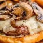 A hearty and satisfying Mushroom and Swiss Burger featuring juicy beef patties, creamy Swiss cheese, and a flavorful mushroom mixture.