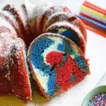 The swirls of vibrant red and blue amidst the creamy white batter tell a story of unity, joy, and festivity. It brings families together, creating memories through shared experiences. Whether you’re hosting a backyard BBQ or simply looking to brighten your family’s weeknight dessert, this cake stands as a reminder of the warmth and togetherness we cherish.