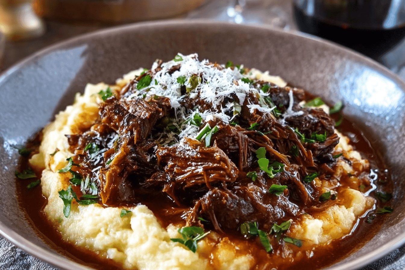 You’ll start by browning beef short ribs, building a base with onions, garlic, tomato paste, and broth, then letting it all simmer low and slow. While that magic happens, you’ll whip up creamy mashed potatoes with melted parmesan folded in.