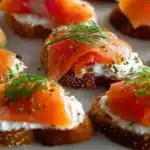A delightful combination of smoky salmon and creamy herbed cheese on crispy baguette slices, perfect for any occasion.
