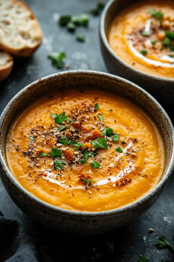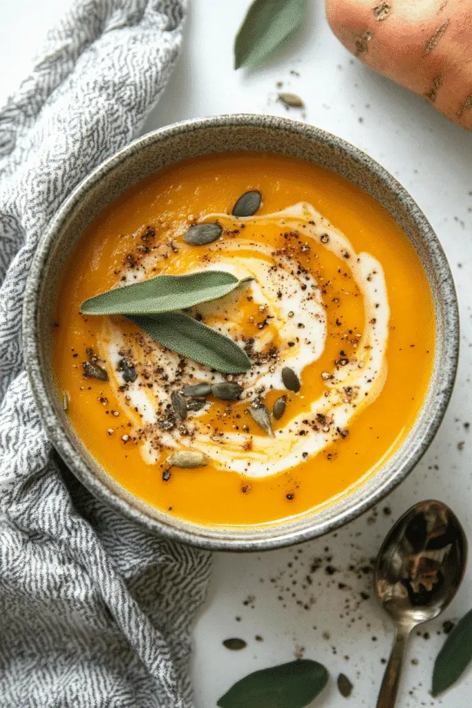 A cozy bowl of spicy butternut squash and sweet potato soup, perfect for warming your soul.