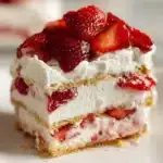A delightful no-bake dessert featuring layers of cream cheese filling, fresh strawberries, and crunchy cookies.