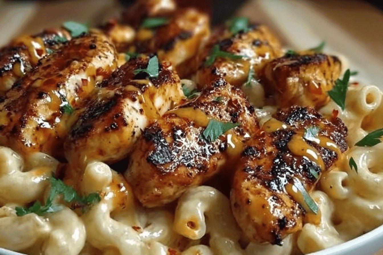 This dish brings together the best of both worlds: fiery-sweet glazed chicken and ultra-creamy homemade macaroni cheese. The chicken is marinated in a sticky sauce of honey, soy, and vinegar, then seared and finished in its own thickened glaze. The macaroni cheese? Gooey, cheesy, sharp, and silky.