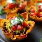 Delightful bite-sized taco cups made with savory ground beef, gooey cheese, and crispy wonton wrappers—a playful twist on classic flavors.