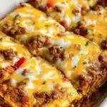 A comforting fusion of tacos and lasagna, packed with layers of seasoned ground beef, beans, corn, and melted cheese between tortillas.