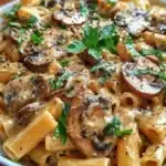A warm bowl of pasta enriched with creamy sauce and fresh mushrooms for a comforting meal.